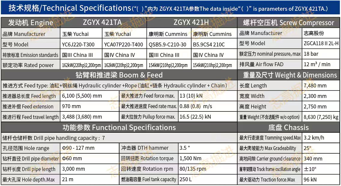 產品特點:1、雙級壓縮螺桿主機超大配置,適應φ90-115mm較佳孔徑的需求。2、其中鑿巖φ90mm孔徑時發(fā)動機的轉速為1450轉,較佳的經濟轉速可保證極低的燃油消耗。3、輕便靈活的機型,強勁的越野能力,可適應狹小空間和原始地貌的作業(yè)。4、可裝入20尺集裝箱,降低運輸成本。5、ZGYX 421H 帶換釬標配物聯網。6、全系一體鉆機采用能效比極佳的兩級壓縮主機,實現高風壓鑿巖,具有優(yōu)異的燃油經濟性表現,更加環(huán)保。7、雙速行走馬達和±10°的調平油缸設計,保證鉆機在平坦地帶的高速移動和原始地貌的機動越野。適用工況:該款產品適用于工程建筑(公路、水電、機場、碼頭)、綠色礦山(水泥、煤礦、采石、鐵礦)、非爆破行業(yè)(房地產、邊坡治理)等。